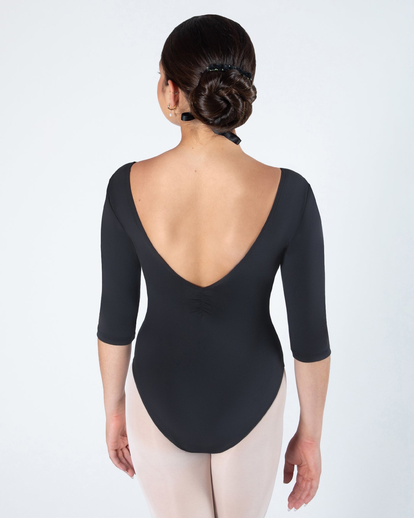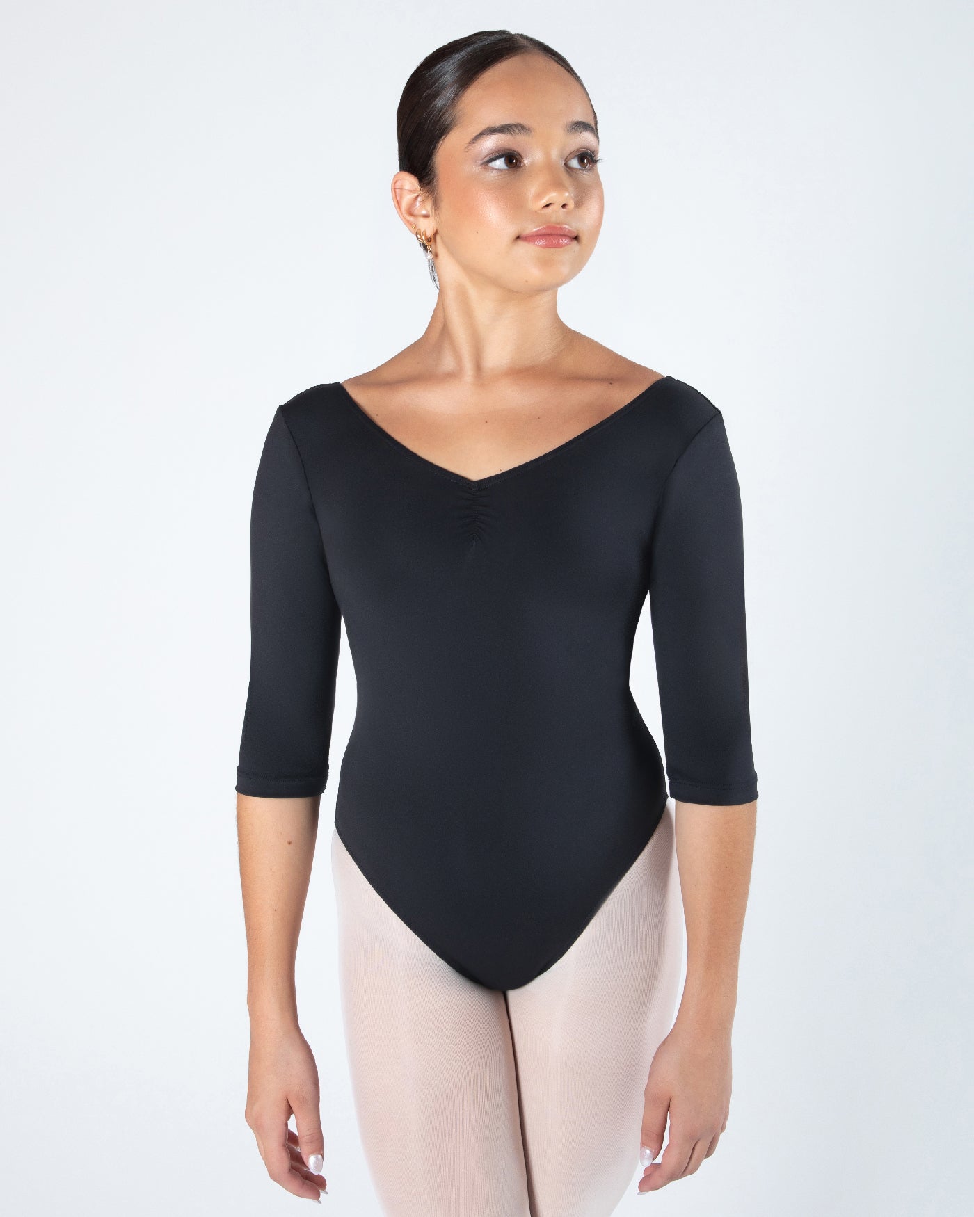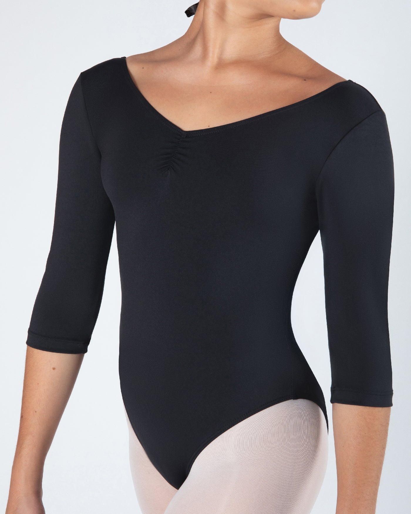 - A classic V neck line is finished with a delicate gather detail