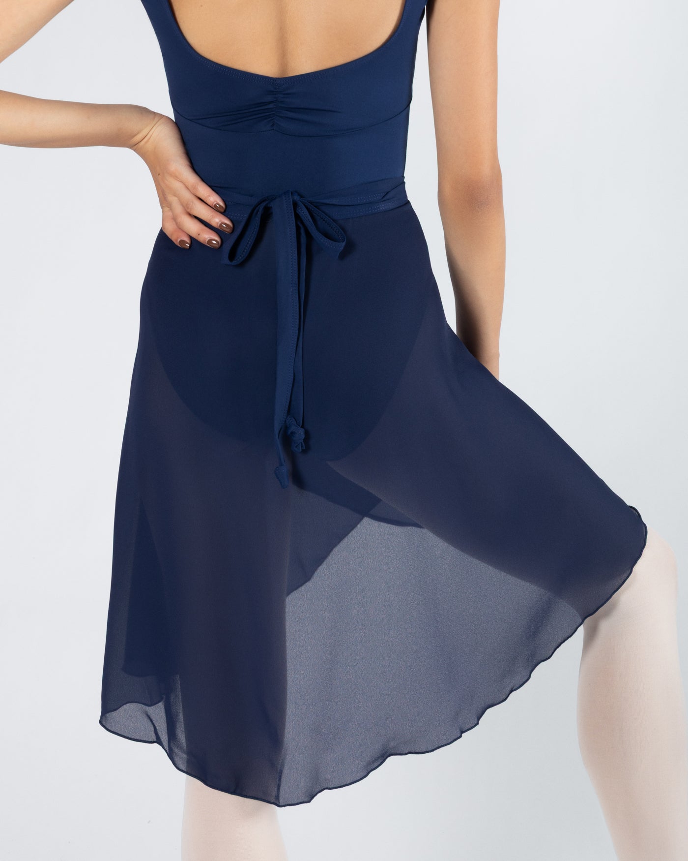 This is a sheer fabric with a beautiful drape. This delicate fabric flows as you move and highlights your lines for a classical look. Take care not to hitch or pull the garment.
