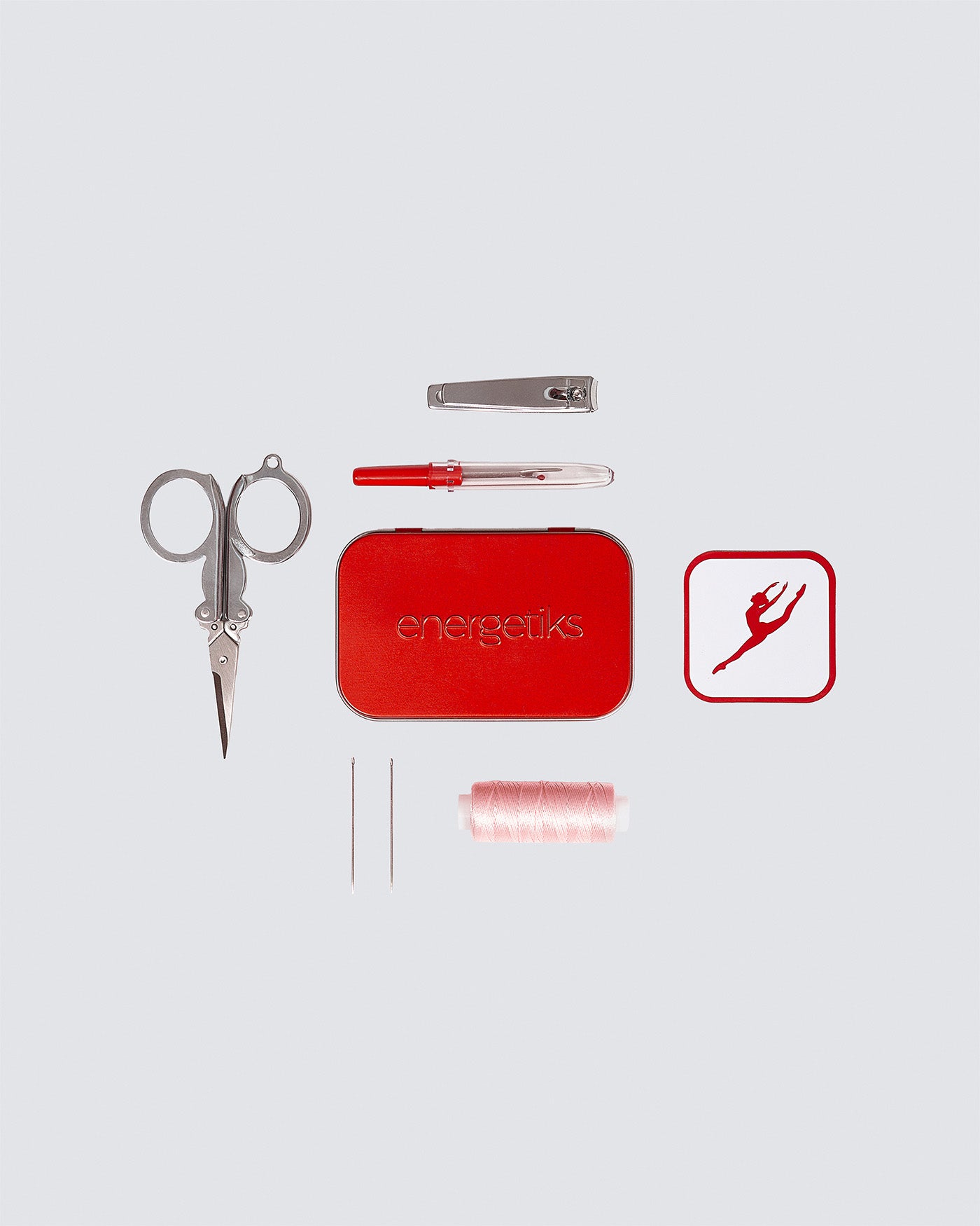 Contains: Spool sewing thread, two needles, compact scissors, unpicker, nail clipper, magnet and tin